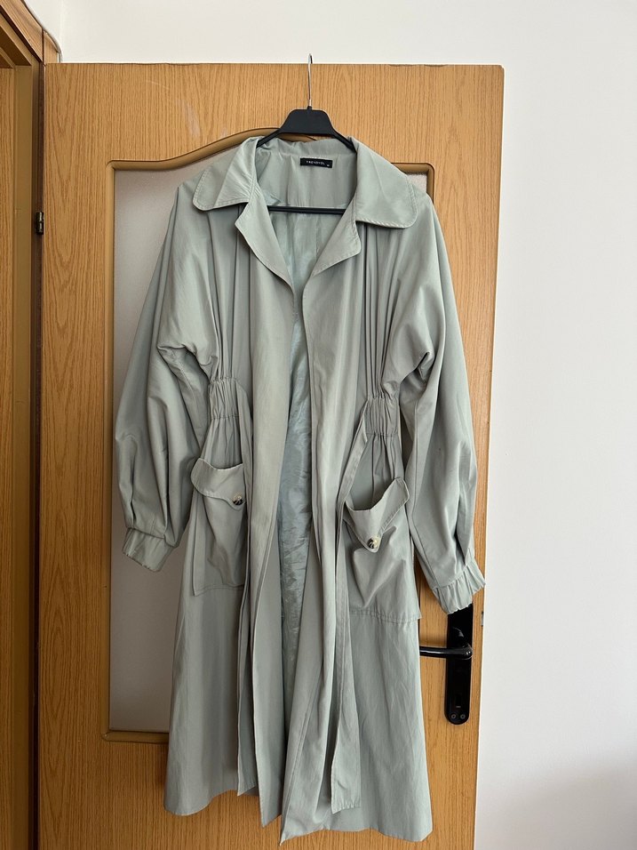 uzun trençkot, salaş kesim ve drapeli detaylara sahip, notched lapel yaka ile günlük sokak stiline uygun.