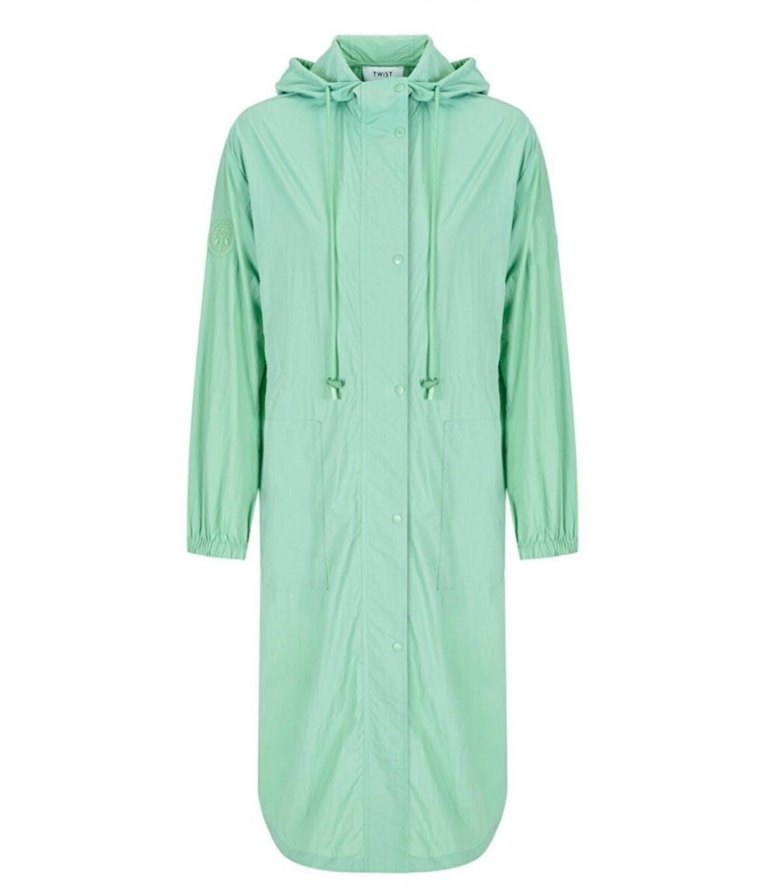 Bol kesim, uzun kollu, düğmeli kadın yağmurluğu. Sentetik kumaştan, pastel yeşil renkte, günlük rahat kullanım için uygundur. ️hiç giyilmedi