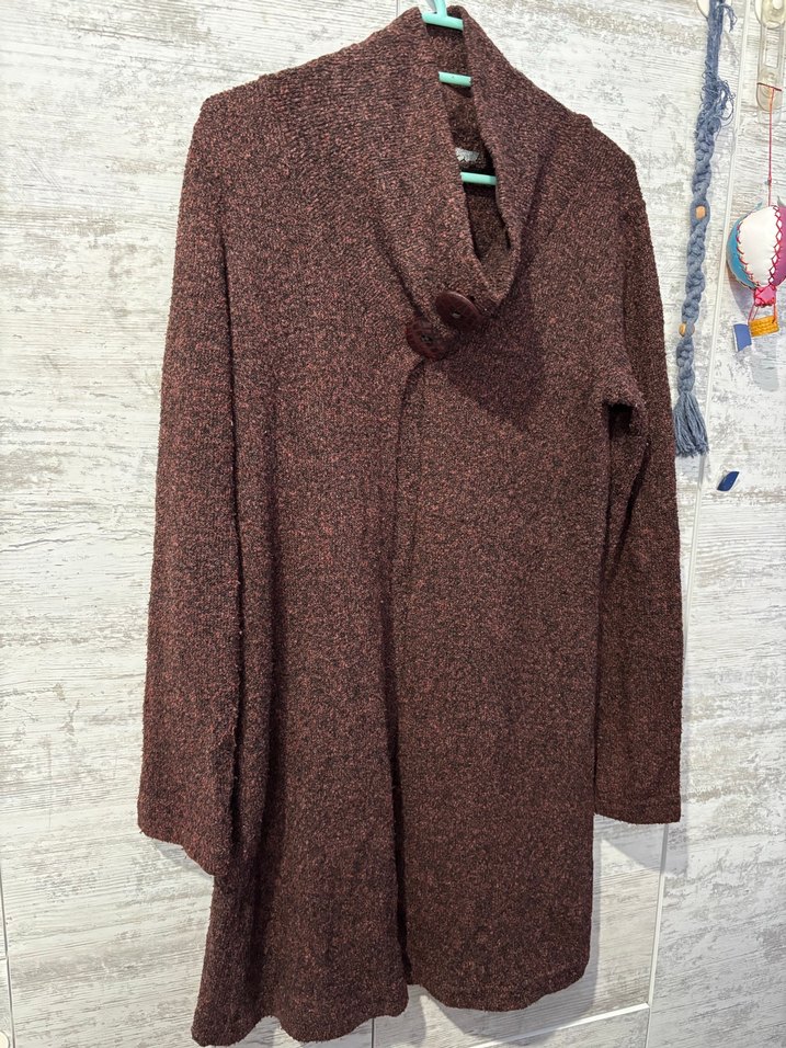 Uzun, bol kesim kadın kazağı, örgü dokulu ve düğmeli boğazlıdır. Yumuşak yün malzemeden, koyu kahverengi renkte, günlük rahat sokak stiline uygundur.