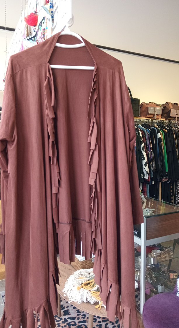 Bu kadın sabahlık uzun kollu ve bol kesimdir. Koyu kahverengi renkte, bohem tarzda ve kenarlarında püskül detayları bulunur.
