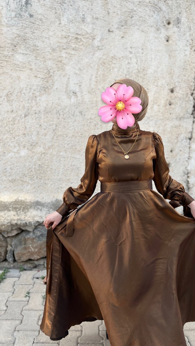 Yüksek yakalı, drapeli, uzun kahverengi elbise. Fitted kesim, bohem tarzı ve ince çiçek desenli. Strappy kollu, tesettür için uygun. Bir kes giyildi şalıyla birlikte gönderilecektir