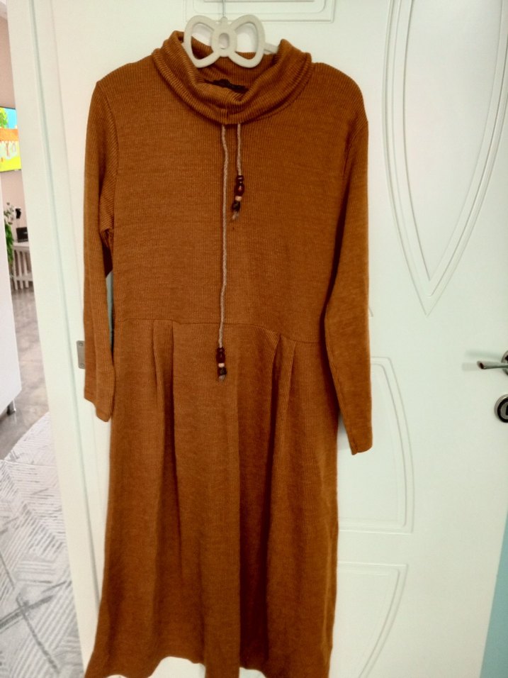 Uzun, bol kesim triko elbise yüksek yakalı ve uzun kolludur. Koyu kahverengi rengi ve örme dokusu, rahat ve bohem bir tarz sunar.
