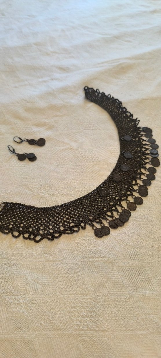 Boncuklu, işlemeli detaylar ve madeni para süslemeleriyle uzun kahverengi bohem tarzda kadın kolye, günlük kullanım için uygun.