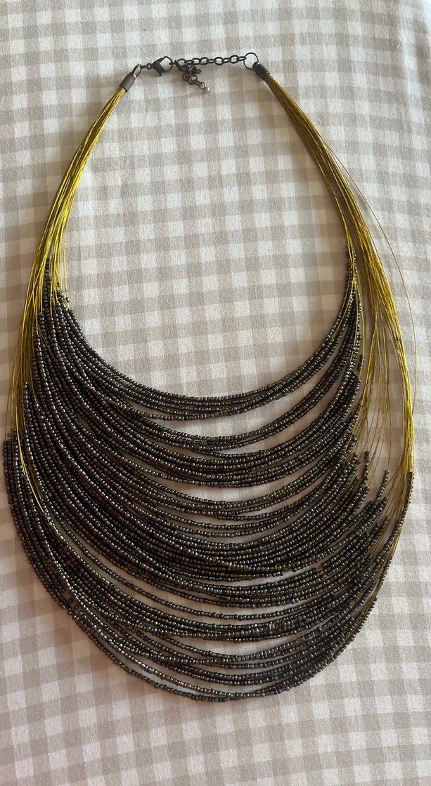 Uzun kahverengi boncuklardan oluşan bu bohem kolye, çok katmanlı işleme görünümü sunar. Günlük kullanıma uygun, retro ve hippie tarzında bir aksesuar.