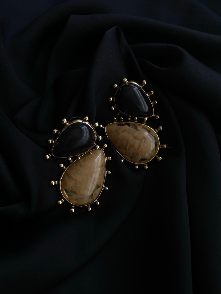 Uzun kahverengi, boncuk detaylı, vintage bohem tarzda küpeler. Desenli tasarımıyla romantik buluşmalar için uygun.