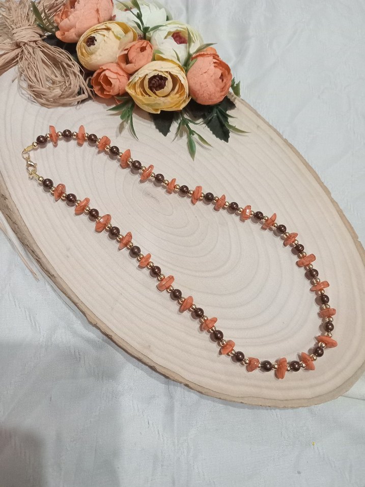 Uzun kahverengi kolye, boncuk detaylı ve hafif batik desenli, minimalist ve bohem tarzıyla günlük kullanıma uygun.