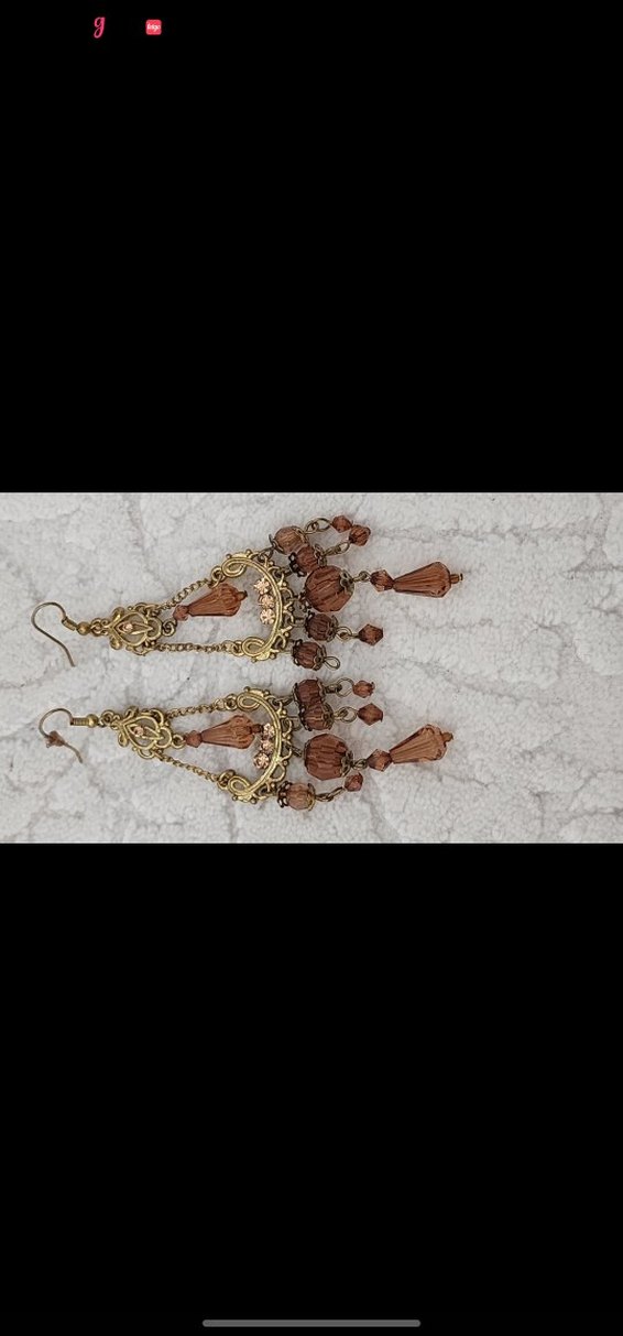 Uzun kahverengi, nakışlı desenli ve boncuk detaylı küpeler