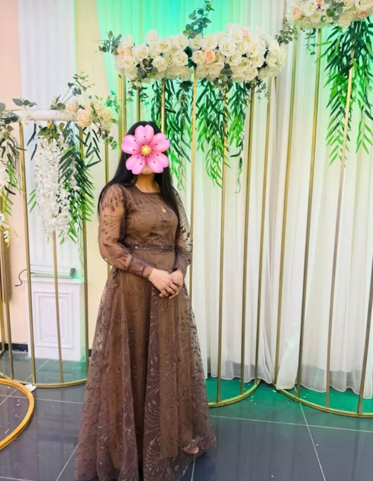 Uzun kahverengi çiçek desenli, bol kesim ve drapeli bohem tarzda kadın elbise. Kayık yaka ve uzun kolludur, mütevazı bir düğün görünümü için uygundur. Özel dikim abıye bır defa tek gıyıldı