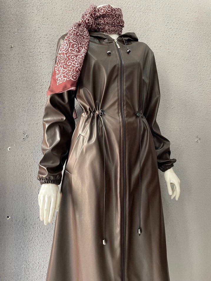 Uzun Kahverengi Deri Yağmurluk