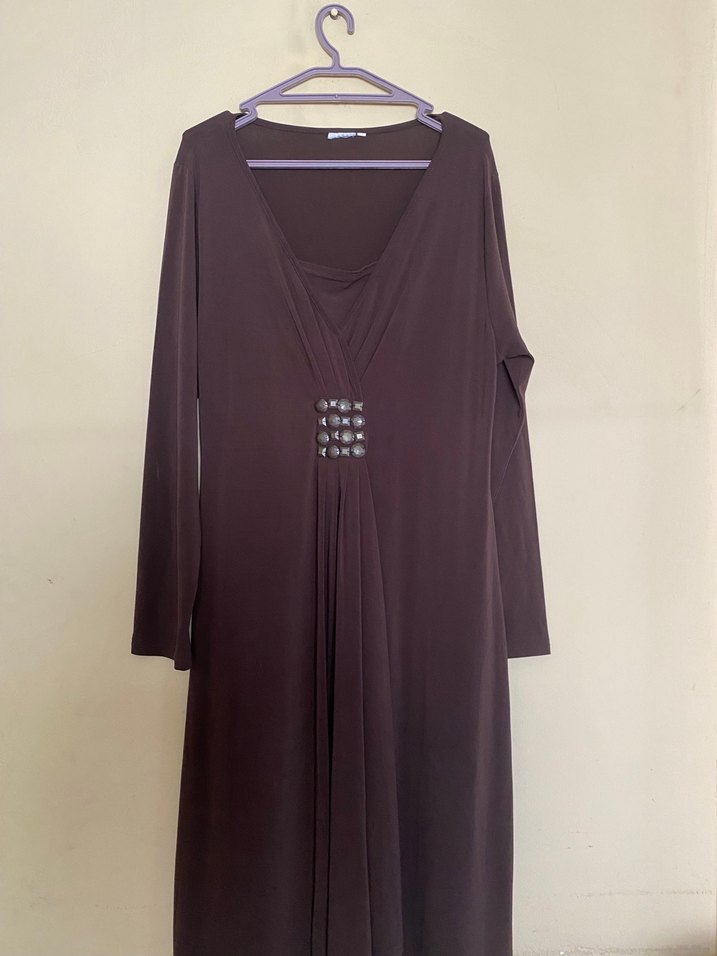 Uzun kahverengi hamile tunik, V yakalı ve drapeli tasarıma sahip. Uzun kollu, bol kesim ve önünde dekoratif detay bulunur. Ofis için uygun, minimal ve gotik tarzda.