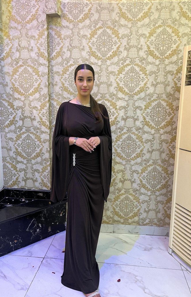 Uzun kahverengi drapeli elbise, straplez yaka ve uzun kollu etnik desenlerle, salaş ve çağdaş kesimiyle mütevazı ve gösterişli bir düğün tarzı sunar. ✨