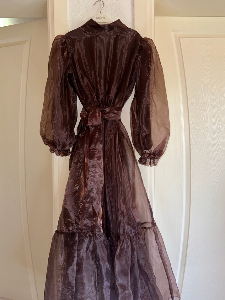 Uzun kahverengi elbise, satenimsi kumaş, drapeli tasarım, yüksek yakalı ve bol kesimdir. Askılı uzun kollu, vintage bohem tarzındadır, düğün için uygundur.