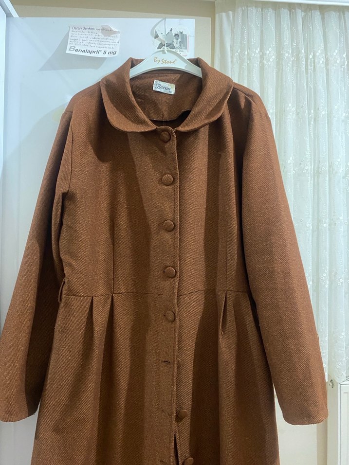 Uzun kahverengi düğmeli pardesü, dokuma kumaş mevsimliktir marka temsilidir