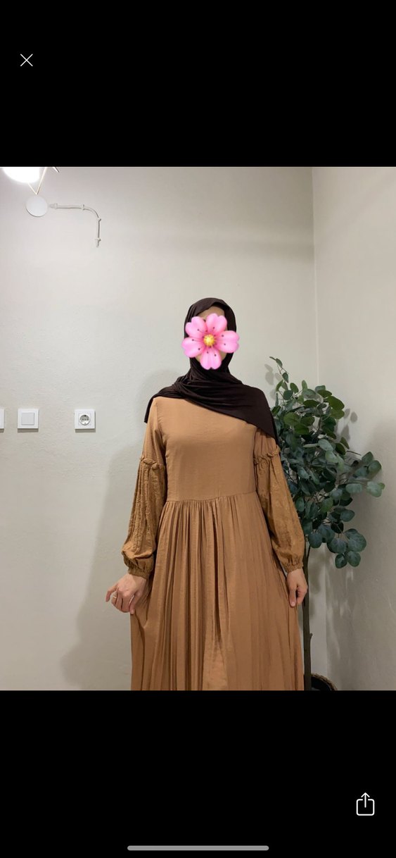 Uzun kahverengi elbise, salaş kesim, drapeli uzun kollu ve yüksek yakalıdır. Sentetik kumaştan yapılmış, günlük kullanıma uygun bohem ve modest tarzda bir üründür.