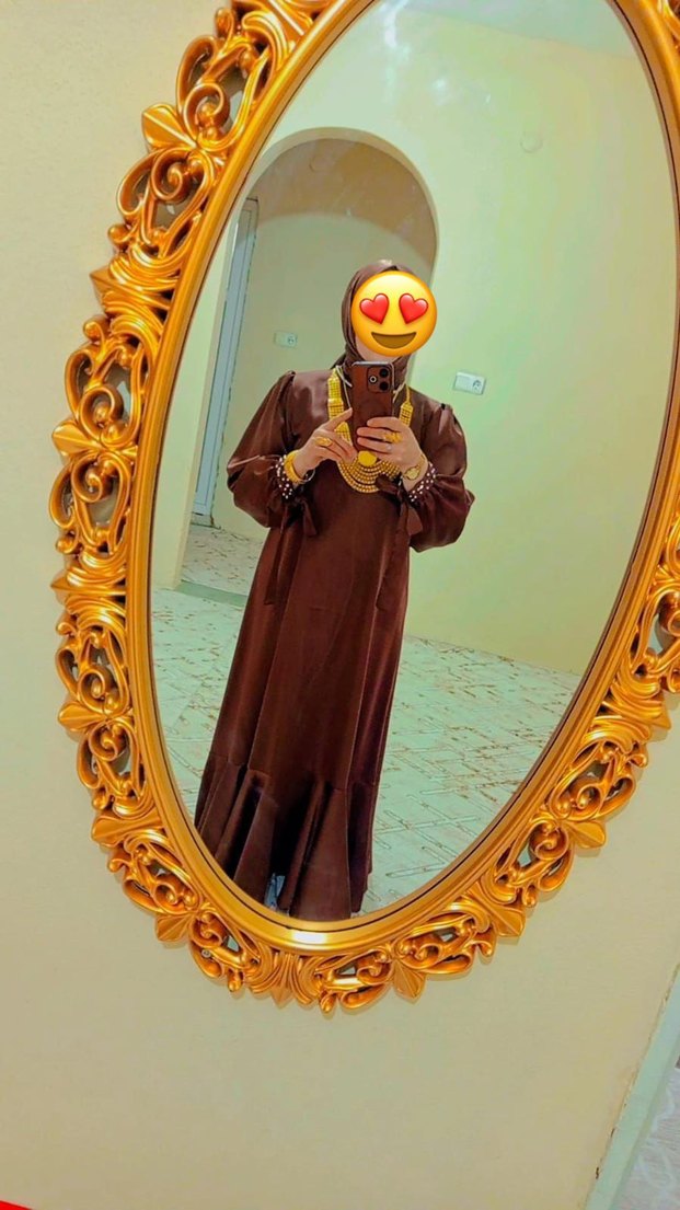 Uzun kahverengi elbise, yüksek yakalı ve uzun kollu, bol kesimdir. İpeksi kumaştan, hem günlük hem düğünluk elbise