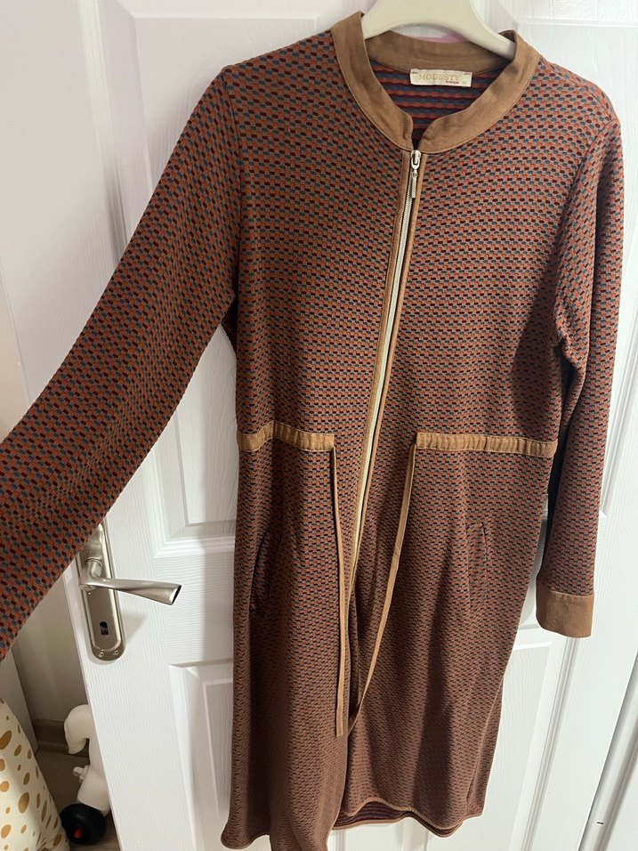 Uzun kahverengi fermuarlı ön ve kesimli yaka detayına sahiptir. Uzun kollu, rahat kesim, yumuşak tekstil kumaştan, günlük kullanıma uygun rahat