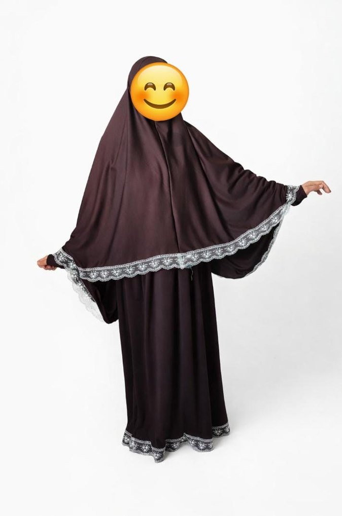 Uzun, bol kesim kahverengi namazlık elbise, yüksek yakalı ve drapeli tasarıma sahiptir. Kenarlarında işlemeli detaylar bulunur. Modest ve gotik tarzıyla günlük kullanıma uygundur. ✨