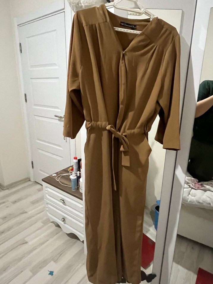 Uzun, kahverengi, bol kesim tulum çepli , uzun kollu ve kuşaklıdır. Minimalist, desensiz tasarımı normcore stiline uygundur.