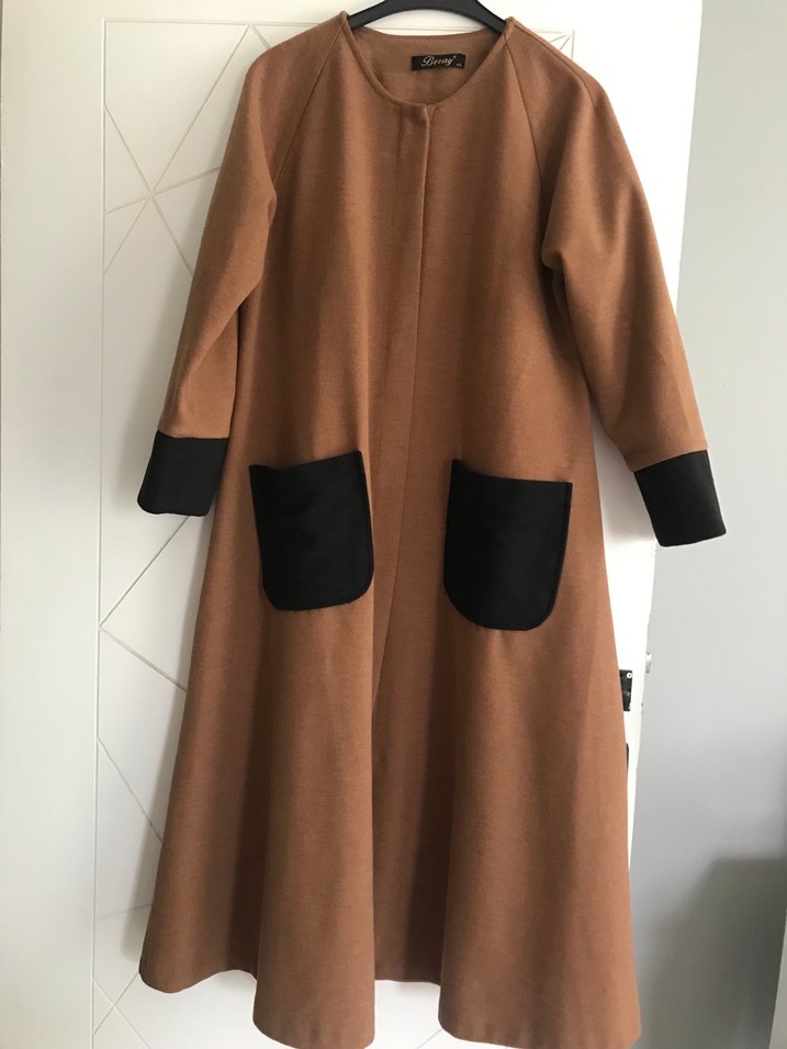 Uzun kahverengi kadın kaban, siyah cepler ve manşetlerle gevşek kesim ve dökümlü tasarıma sahiptir. Rahat kumaşlı, uzun kollu ve yakası çentikli.
