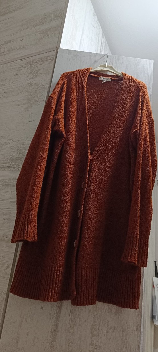 Uzun, bol kesim kahverengi yün örgü hırka. Uzun kollu ve yaka detaylı, bohem tarzda, günlük kullanıma uygun.