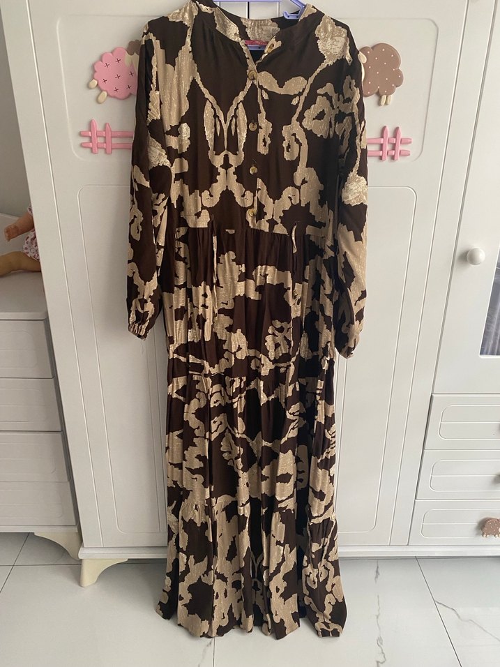 Bu uzun kahverengi elbise, pilili detaylar ve yüksek yakaya sahip bol kesimdir. Koyu tonlu batik desenli, ince askılı ve tekstil kumaştandır. Günlük kullanım için uygundur.