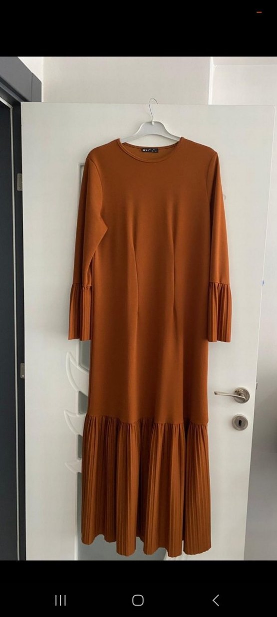 Uzun kahverengi elbise, kolları ve etek ucu pilili, salaş kesim ve yuvarlak yaka detaylarına sahiptir. Minimalist ve bohem tarzlara uygundur.