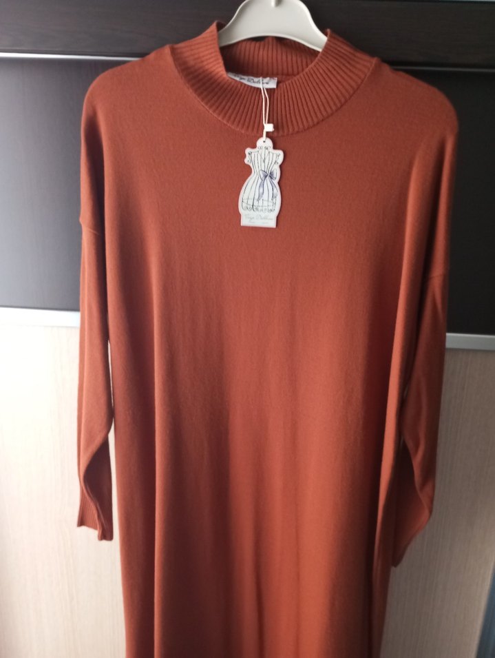 Uzun kahverengi triko tunik, yüksek yakalı ve uzun kolludur. Rahat ve bol kesimiyle günlük sokak stiline uygundur. #elbise