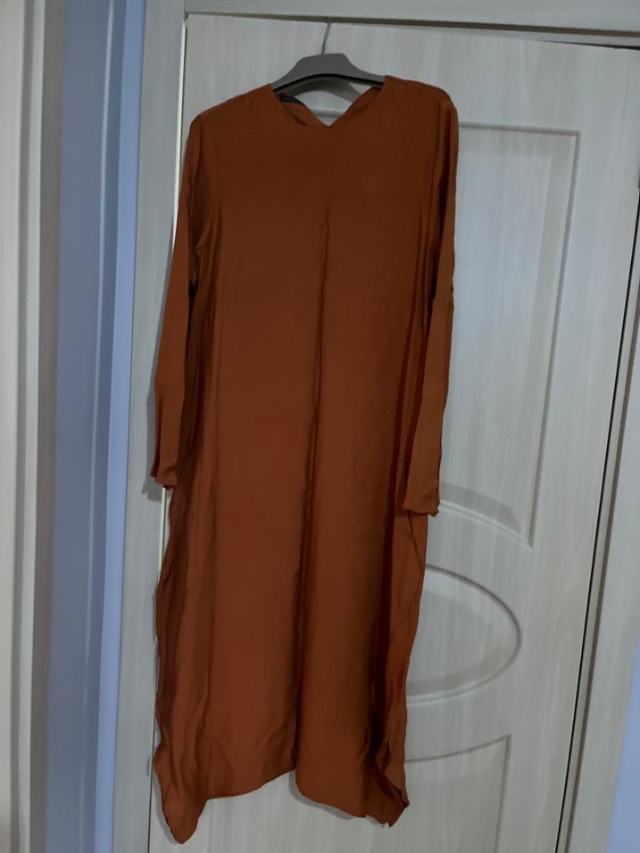 Uzun kahverengi tunik, salaş kesimi ve drapeli tasarımıyla V yakaya sahiptir. İpek gibi kumaştan üretilmiş, günlük sade sokak stiline uygundur.