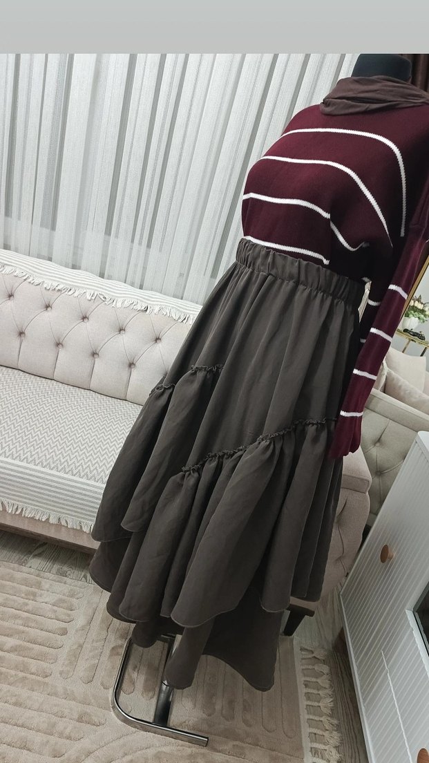 Uzun kahverengi etek, salaş kesimi ve volan detaylarıyla, yumuşak sentetik kumaştan üretilmiş, bohem tarzda rahat bir görünüme sahip. kendi dikimimdir