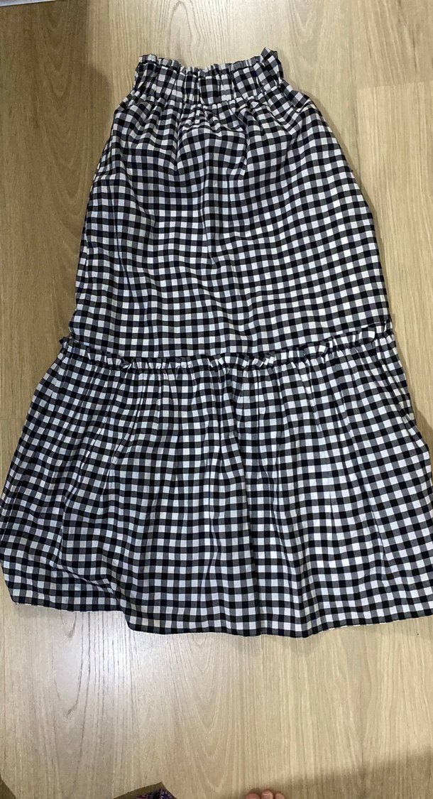 Sentetik kumaştan, siyah beyaz kareli ve fırfırlı detaylı uzun, bol kesim Bohem tarzda, günlük kullanıma uygun.