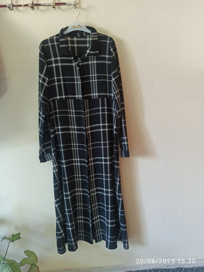 Uzun, kareli siyah elbise, bol kesim ve uzun kolludur. Düğmeli, yakalı ve sentetik kumaştan üretilmiştir, rahat sokak stili için uygundur.