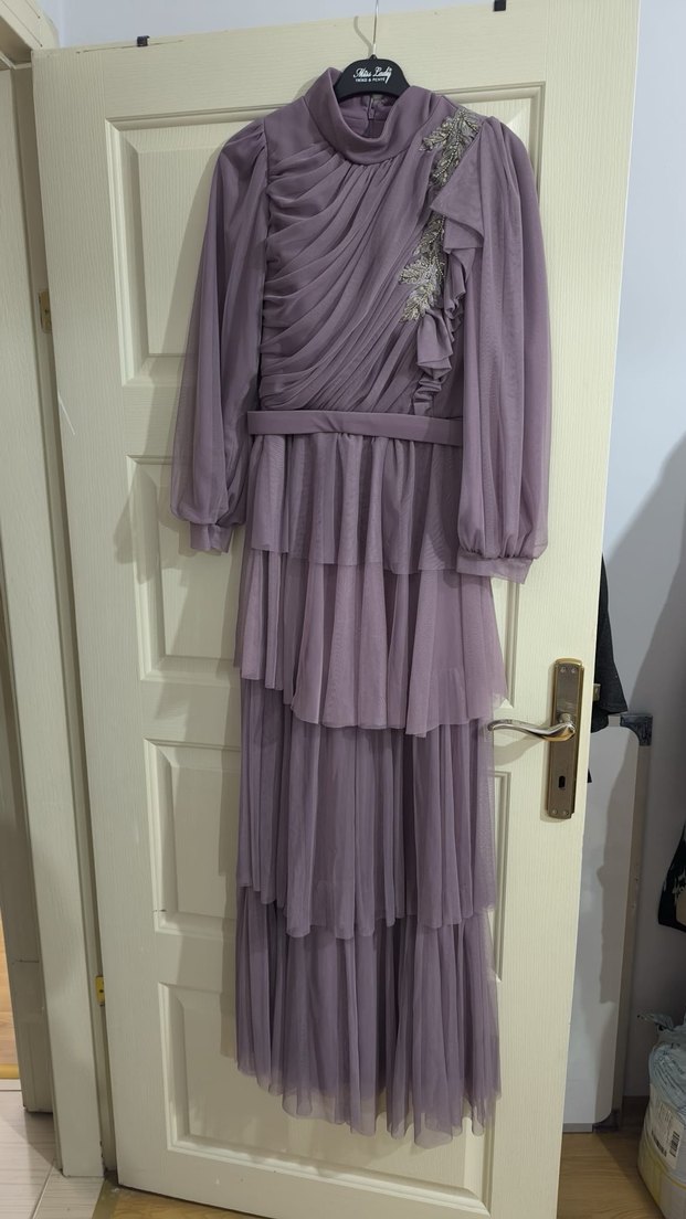 Bu uzun mor abiye elbise, nakış detaylı drapeli katmanlara ve yüksek yakaya sahiptir. Uzun kollu ve vücuda oturan kesimlidir, düğünler için uygundur. Sadece bir kere giyildi, defosu yok.