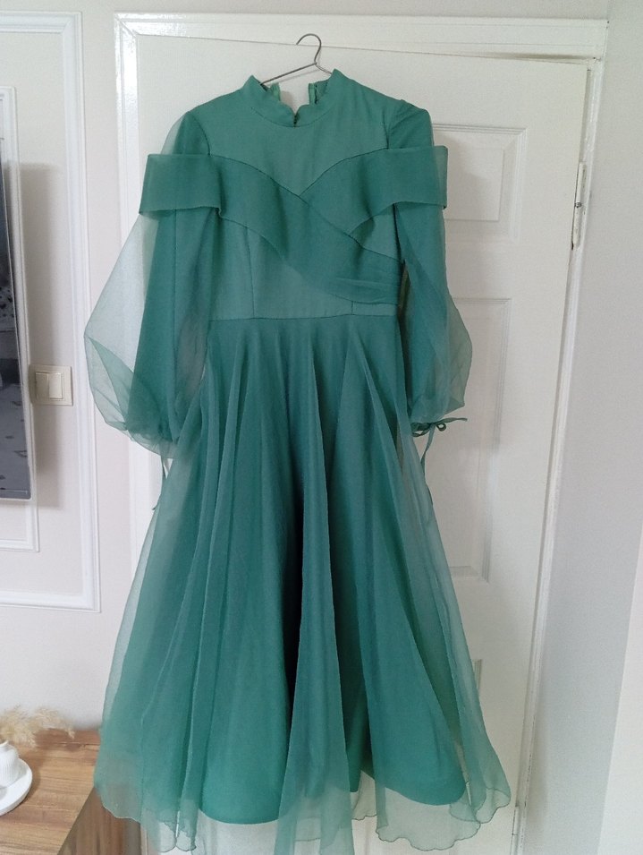 Uzun, pastel yeşil abiye elbise yüksek yakalı ve uzun, şeffaf kolludur. Katlı ve bol kesimiyle modern klasik bir görünüm sunar, düğünler için uygundur. Desensiz kumaşı vintage tarzı tamamlar.