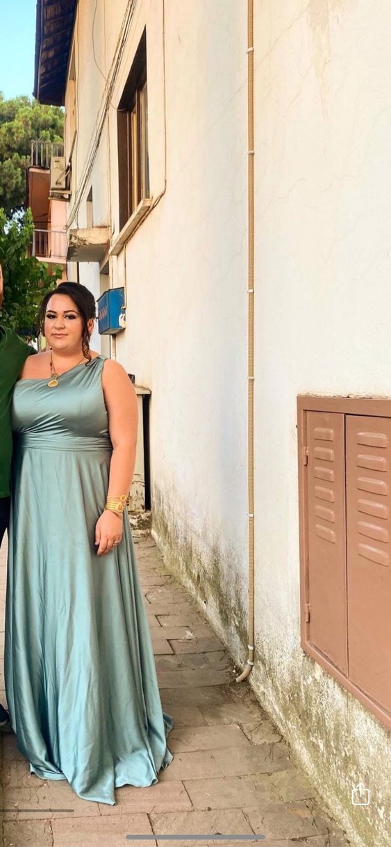 Bu açık haki abiye elbise, drapeli kayık yaka, askılı kollu ve bol kesimiyle düğün ve özel günler için uygundur.