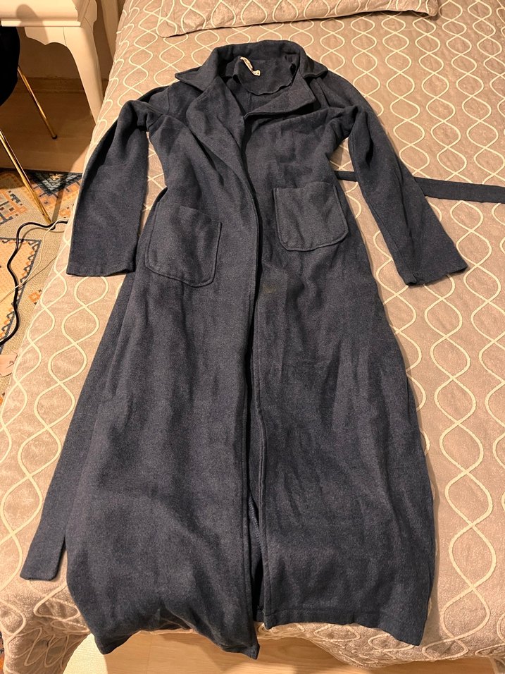 Uzun, koyu mavi renkli keten kadın kabanı, kesimli yakaya ve kemerli dar kesime sahiptir. Uzun kollu ve cepli, günlük kullanıma uygundur.