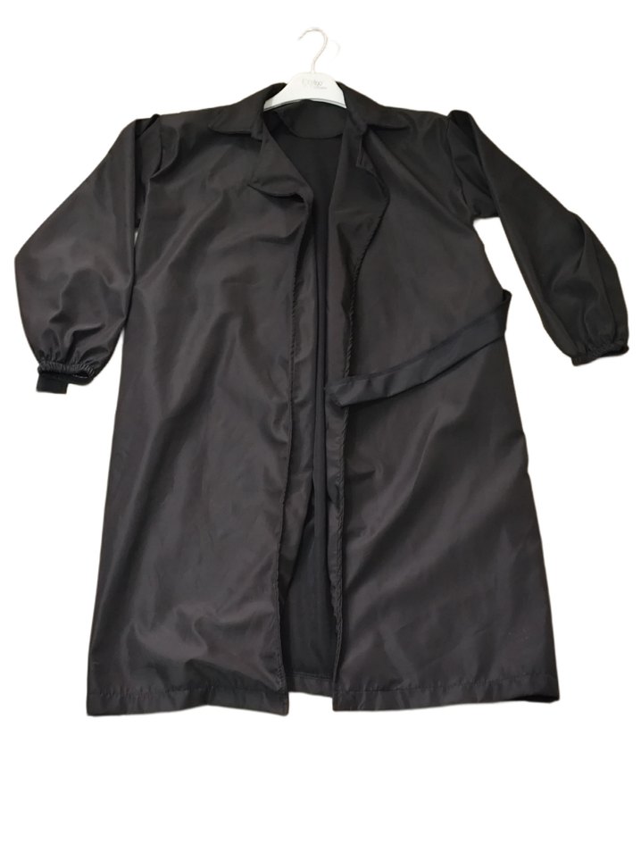 Siyah uzun yağmurluk, uzun kollu ve kemerli bel detayına sahiptir. Notched lapel yakalı, bol kesim ve sentetik kumaştandır. Minimalist ve gotik tarzda günlük kullanıma uygundur. ️