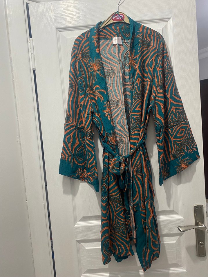 Uzun, bol kesim turkuaz renkli batik desenli kimono, uzun kollu ve kemerli. Straplez yakaya sahip bohem tarzda, günlük kullanım için uygun.