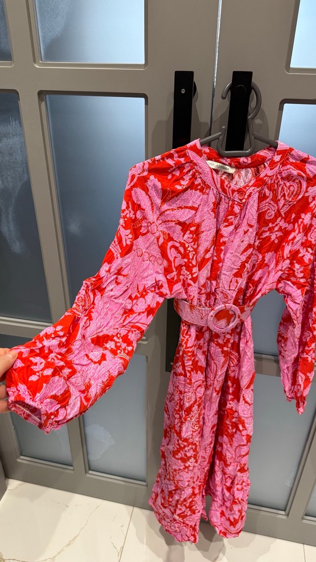 Uzun kollu, kırmızı ve pembe tonlarda renkli batik desenli bohem elbise. Kemerli ve V yakalı, bol kesim günlük kullanıma uygun.