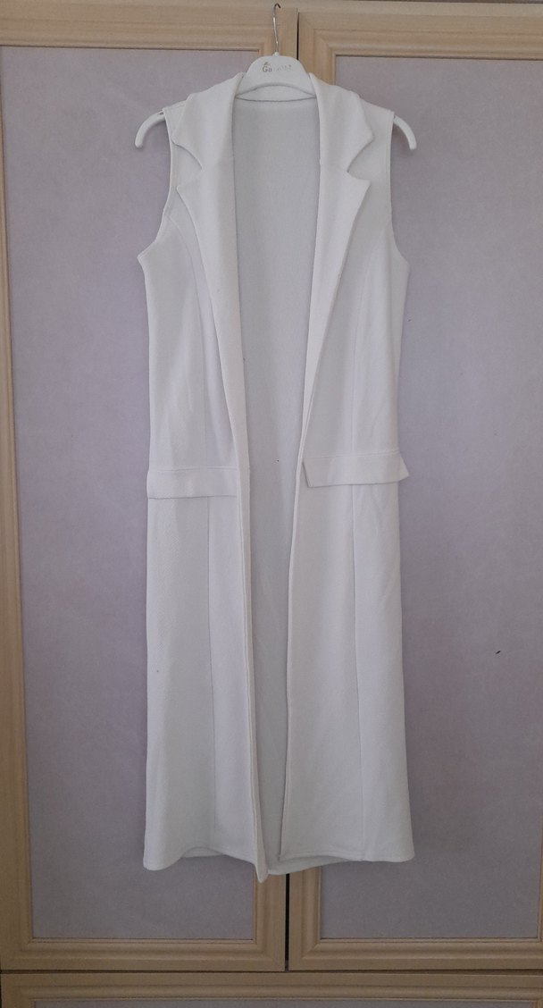 Uzun kesim, kolsuz beyaz yelek, kesikli yakaya ve yan yırtmaçlara sahiptir. Düz ve sentetik kumaştan olup, ofis için minimalist ve şık bir görünüme uygundur. Göğüs 50 Boy 100