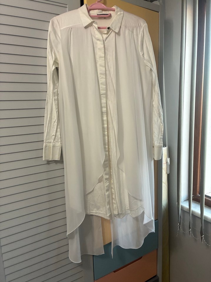 Uzun kesim beyaz pamuk tüllü gömlek, drapeli tasarımı ve kesik yaka detayıyla salaş bir görünüm sunar. Ofis için uygun, hafif ve desensiz bir modeldir.