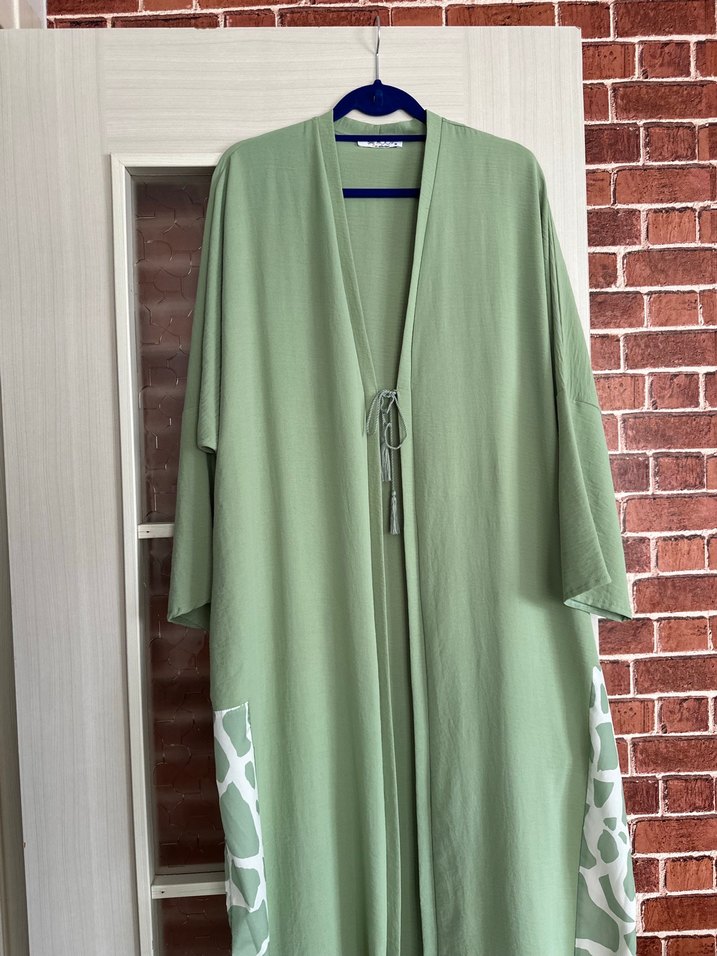 Uzun kesim, bol ve dökümlü kadın kimono, uzun kollu ve yakası kesik detaylıdır. Pastel yeşil renkte, yumuşak sentetik kumaştan, sade ve desensizdir.