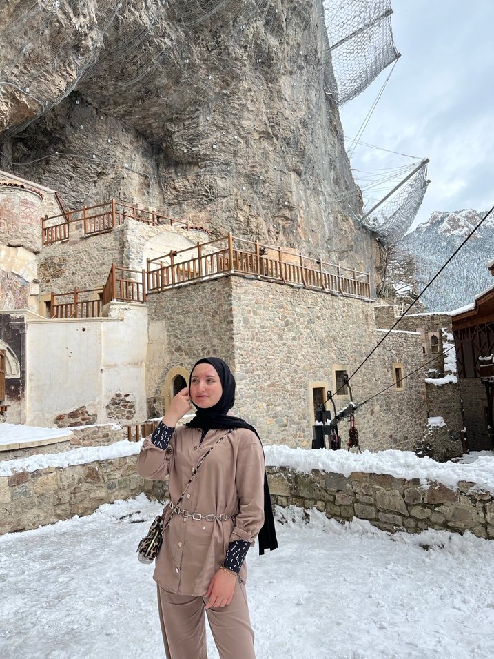 Yüksek yakalı, uzun kollu ve etnik desenli, camel renkli bol kesim kadın takımı. Yumuşak ve sıcak kumaştan, rahat ve şık sokak stili için uygundur.
