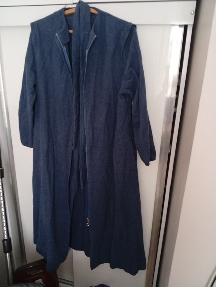 Uzun kesim, bol kesim hamile kabanı, çentikli yaka ve uzun kolludur. Denim kumaştan, drapeli tasarıma sahip, lacivert ve gri tonlarında, günlük kullanıma uygundur.