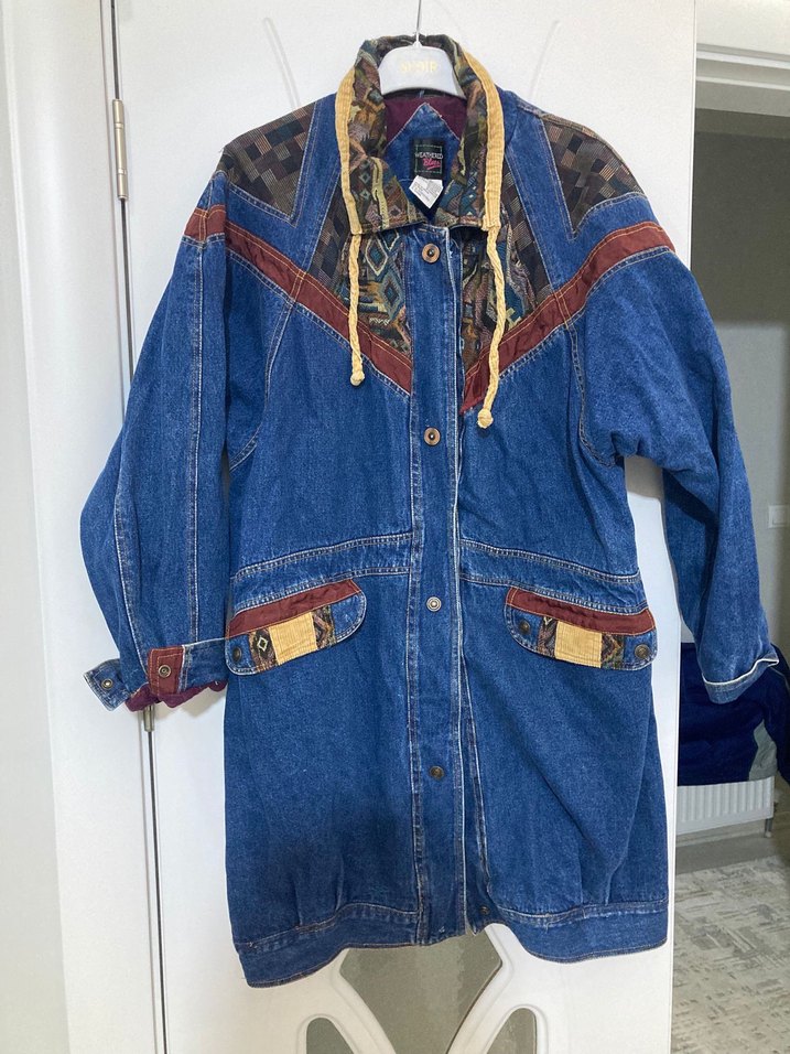 Uzun kesim, bol kesim ve düğmeli bu kadın kot ceket, koyu mavi taban ve desenli detaylara sahip. Bohem tarzı için uygundur, uzun kolludur ve ceplidir.