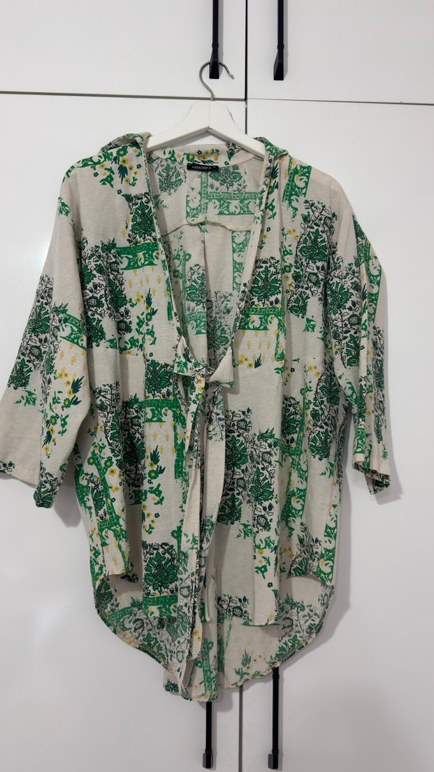 Yumuşak keten kumaştan, uzun kesim, düğmeli ve V yakalı, yeşil desenli bol kesim bohem kimono. Günlük kullanıma uygundur önden bağcıklıdır