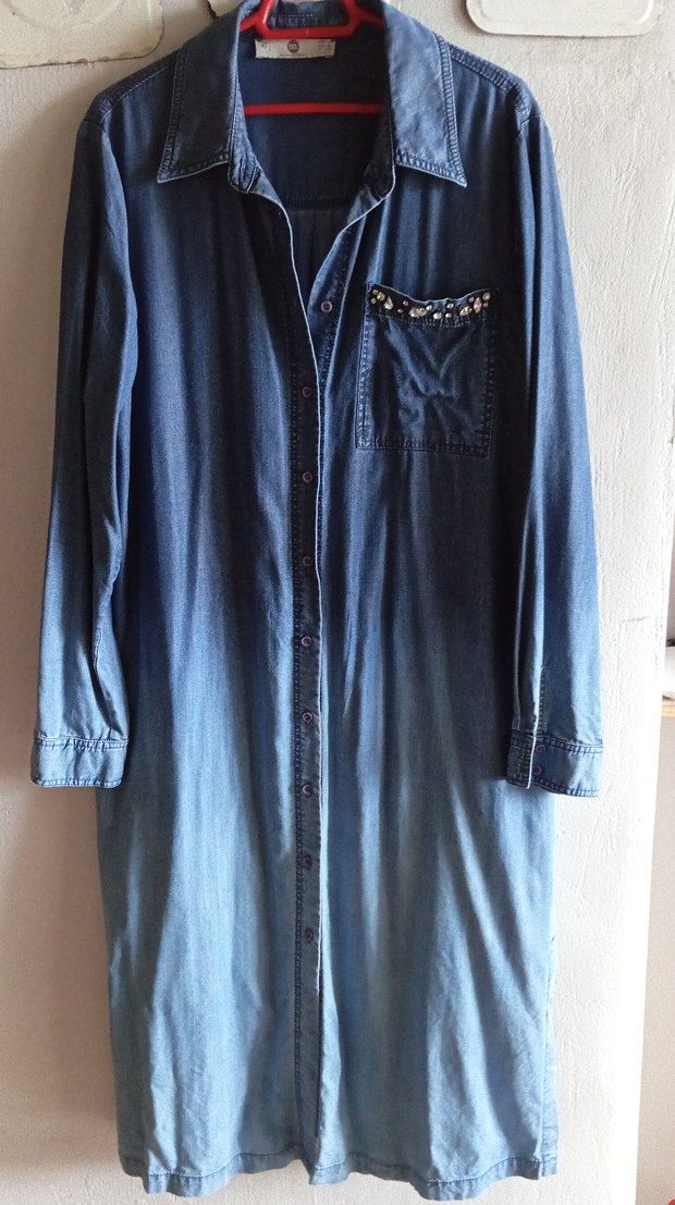 Uzun kesim, düğmeli kadın kot ceket, bol kesim ve kesik yaka ile. Uzun kollu, parlak lacivert batik desenlidir, günlük kullanıma uygun. ✨