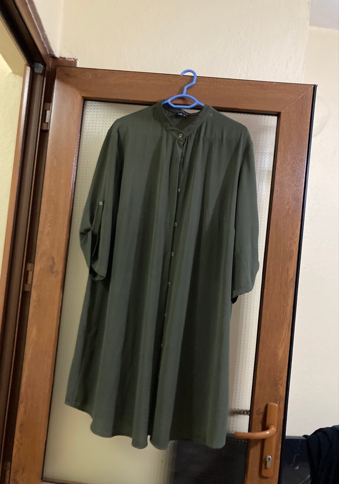 Uzun kesim, geniş kesim keten kadın tunik, yakalı yaka ve kısa kollu. Rahat ve salaş görünümüyle gündelik kullanıma uygundur.