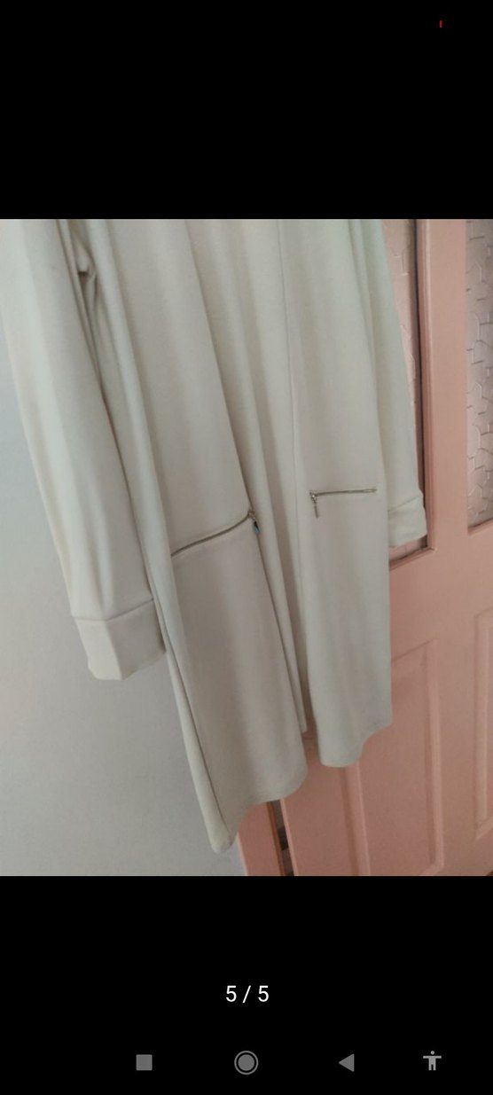 Uzun kesim, bol kesim, uzun kollu ve yuvarlak yakalı gri hamile montu. Fermuarlı cepleri ve yumuşak sentetik kumaşıyla günlük kullanıma uygundur.