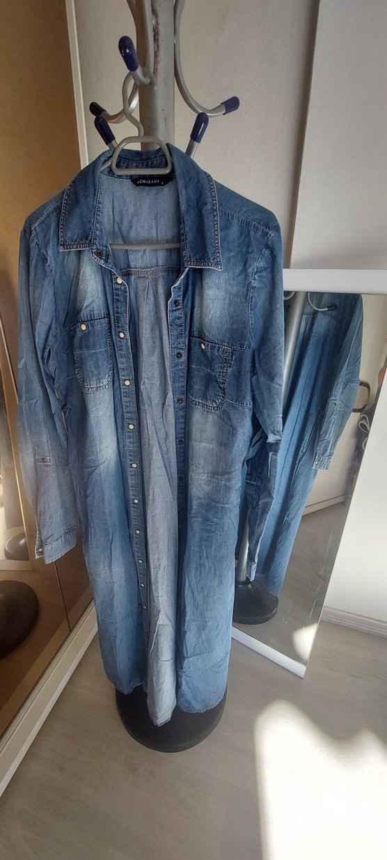 Uzun kesim, bol kesim gri mavi kadın denim ceket. Düğmeli ön, uzun kollu ve notlu yaka detaylıdır. Günlük rahat sokak stili için uygundur.