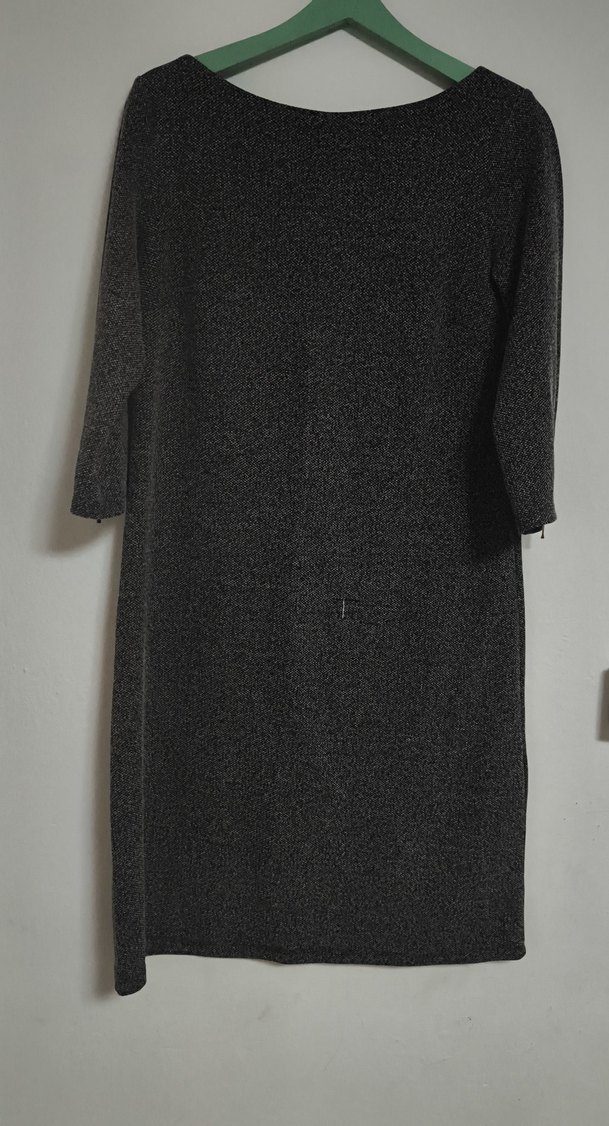 Uzun, salaş kesim triko elbise, drapeli tasarım, yuvarlak yaka ve uzun kollu, yumuşak sentetik kumaştan, minimalist gri-siyah renkte.